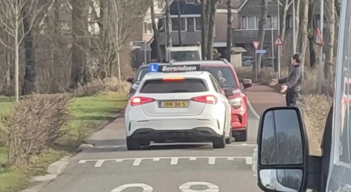 De lesauto bleef staan, de tegenligger bleef staan, en het dorp leek even stil te vallen. Voor omstanders was het bijna vermakelijk, maar voor de leerling voelde het waarschijnlijk als een onverwacht examenmoment midden op straat.